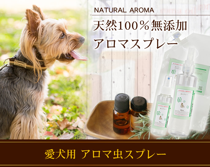 天然アロマ虫スプレーは嫌な虫を意識したアロマのみをブレンドしたスペシャルスプレーです。 天然ナチュラル成分のみで殺虫成分を含まないから愛犬はもちろん飼い主様にも安心して使っていただけます!
