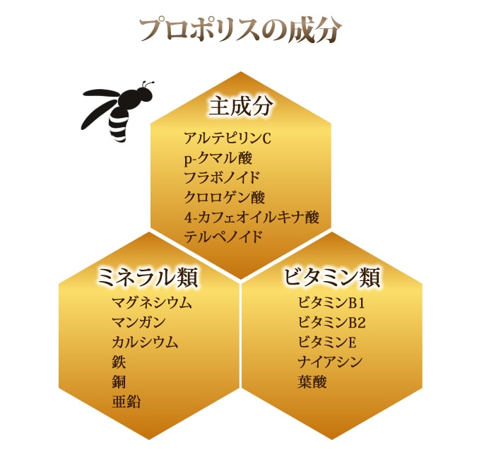 プロポリスにはフラボノイド類が豊富に含まれており、その種類は20種類ほどで、さらにプロポリスに含まれているフラボノイドには糖分がほとんど含まれていません。加えてアミノ酸・ビタミン類・酵素なども豊富に含まれています。