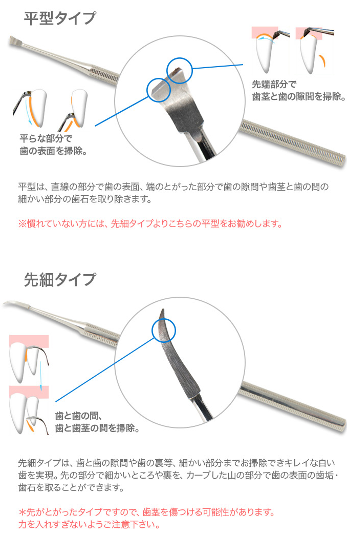先端が細いので引っかかりがよく、歯石が取れやすいです。スケラーを選ぶ際は 「ひっかかりのよさ」がかなり重要 になってきます。歯石がひっかかかりやすくなると、 時間短縮されるのでわんちゃんへの負担も少なくなります。先端が細いため、ペンチで大体の歯石をとった後、 歯の間など、 ペンチでは取りにくい部分の歯石を取るのにスケラーが大活躍します。また、非常に作りが丈夫で、すでに200頭ほどのワンちゃんの歯石を取りましたが、先端は欠け一つありません。 プロの現場の過酷な使用状況にも安心して使える商品です。