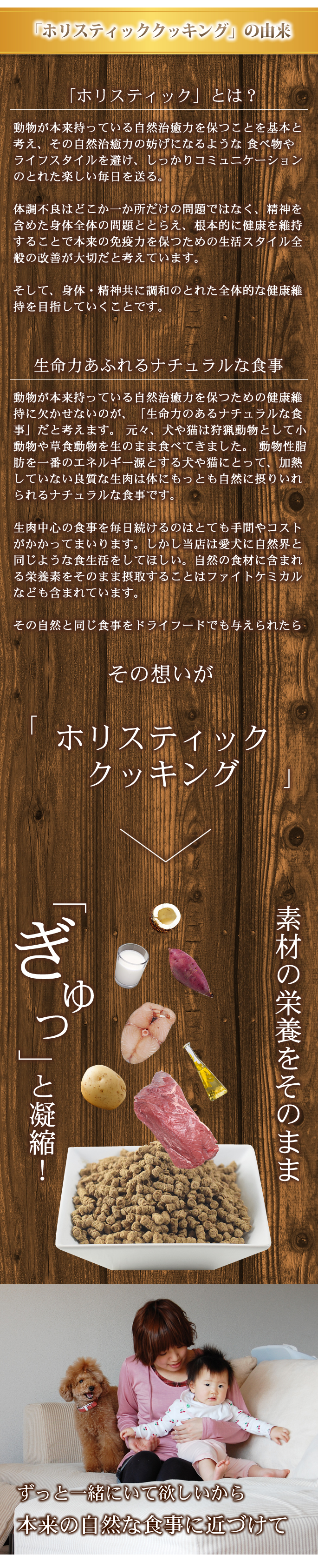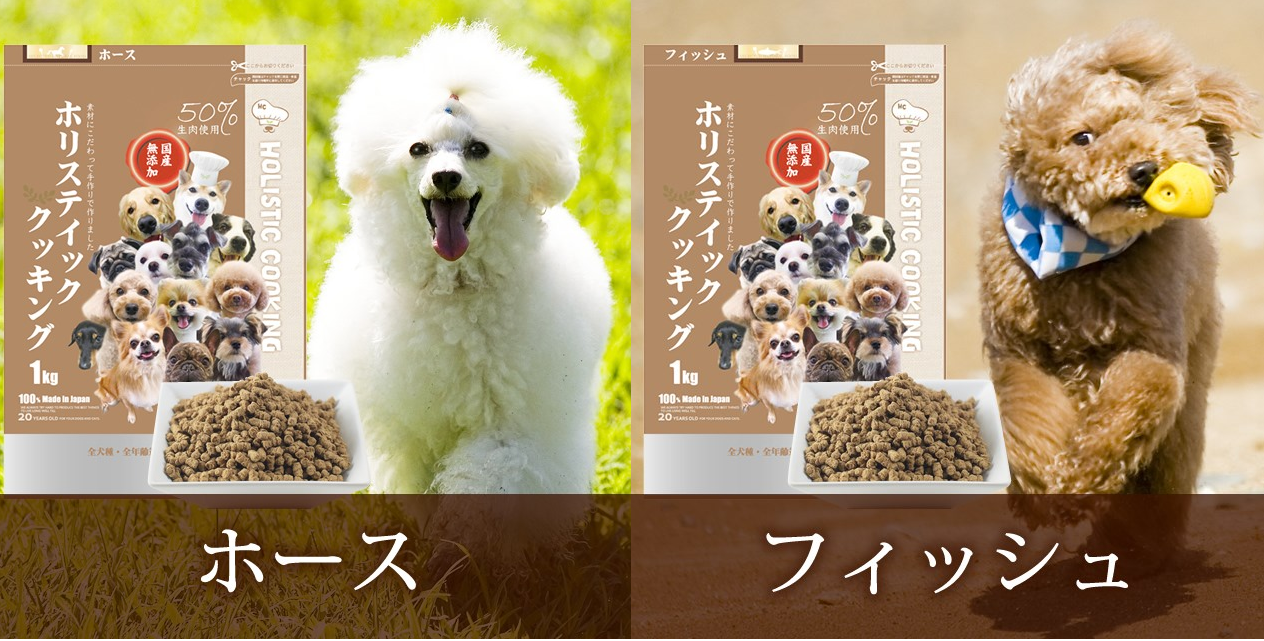 ホリスティッククッキングは「犬に必要な栄養だけを残し、不必要とされるのもは入れない」の考えを基本に生まれた、愛犬にとって本来の食事そのままの総合栄養食です。