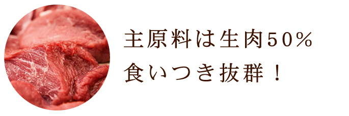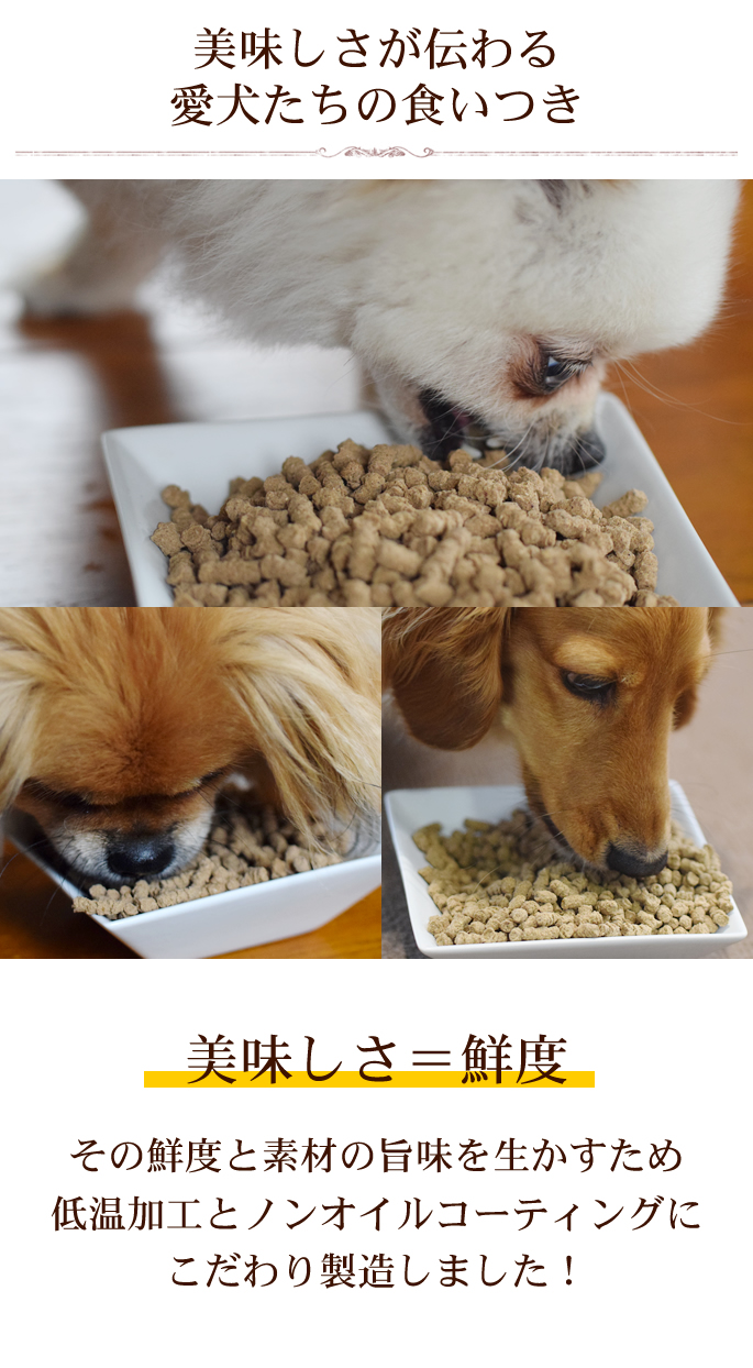 生肉を50%使用しているので嗜好性が高く食いつきの悪い愛犬に配慮しています。またドライフードによくあるオイルコーティングを 行っていないので油の嫌な匂いがなく素材の風味がよく愛犬も大喜びで食いつき抜群!