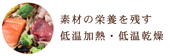 本来ドライフードは高温加熱で素材が持つ栄養素の多くが壊れてしまうため、ビタミン・ミネラルなどの栄養を添加する必要があります。 ホリスティッククッキングは低温加熱・低温乾燥により素材の栄養を残すことで、ビタミン・ミネラルの添加をする必要がなく、AFFCO(米国資料検査官協会)の栄養基準を満たしています。
