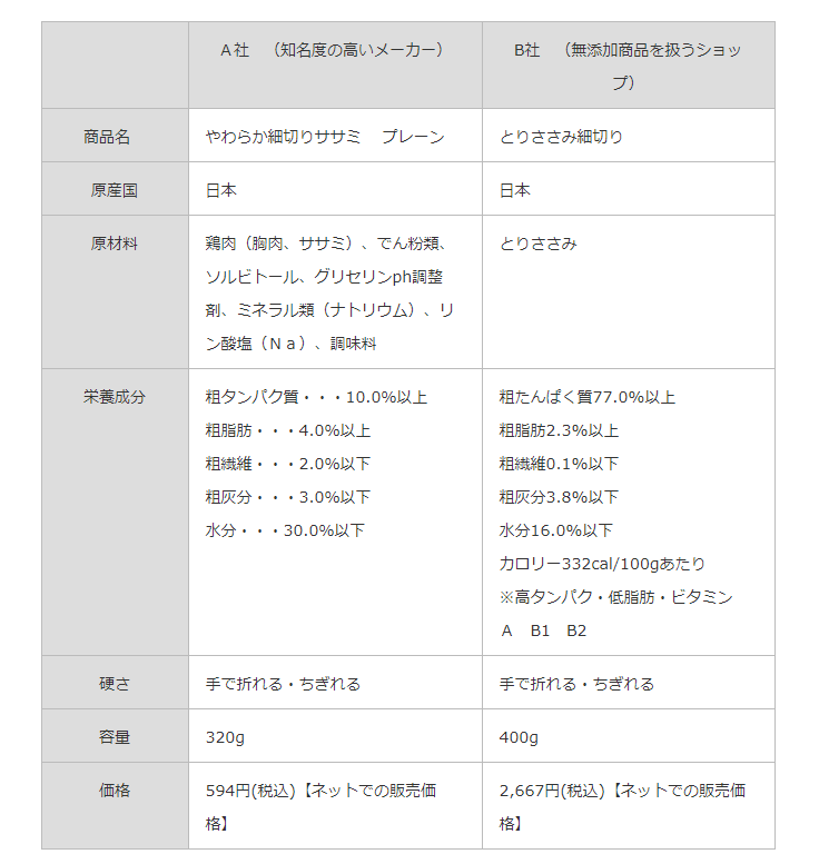 上記の表を比較してみましょう。「ササミ」と商品名にはありますが、原材料をみるとA社ではササミ以外に「胸肉」が含まれていることがわかります。一方のB社の原材料は「とりささみ」のみとなっています。