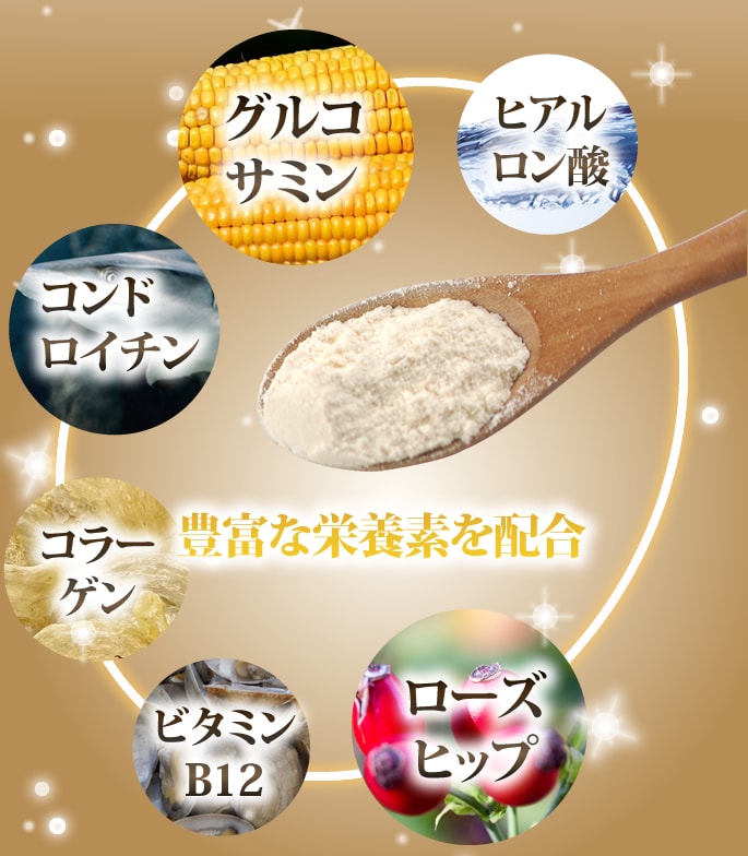 原材料:発酵グルコサミン(植物由来)、天然コラーゲン、天然タウリン、オメガ3粉末、天然コンドロイチン硫酸、天然ヒアルロン酸、銅、ビタミンB12、ナイアシン、葉酸、ローズヒップ、オリゴ糖