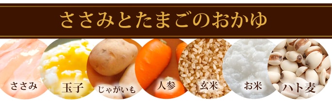 鶏肉(ささみ)、卵、人参、ジャガイモ、玄米、白米、チキンエキス、ハトムギ、米油、乳酸菌