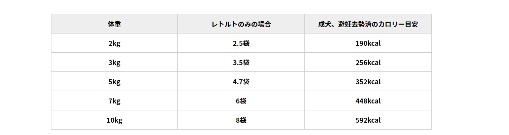このレトルトは一般的なドライフード(350kcal/100gの場合)の約5分の1程度のカロリーです。例えば10gのドライフードを置き換える場合はレトルト50gが目安という事になります。