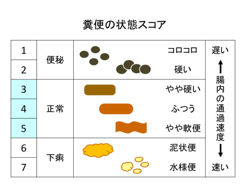 ヒトの便の状態をスコア化したブリストルスケールというものがあります。便秘で硬い便から正常な便、下痢でゆるくなった便というように全部で7段階に分けています。